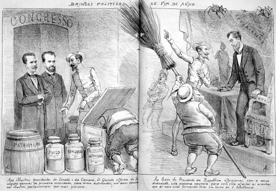 O governo de Prudente de Moraes foi pródigo de conspirações e tentativas de desestabilização (as “aranhas”). Aqui a situação é satirizada com a sugestão de uma medida de força (a vassoura). Don Quixote (Rio de Janeiro) nº 44 – 28/12/1895