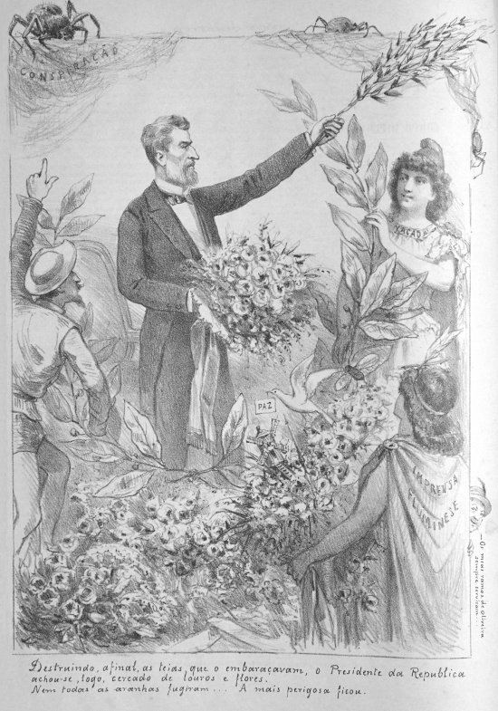 A ironia das “aranhas”. Prudente de Moraes já teria vencido todas, menos a pior delas: a aranha da conspiração para derruba-lo e substituí-lo por um militar florianista ou por seu próprio vice-presidente, Manuel Vitorino. Don Quixote (Rio de Janeiro) nº 29 – 27/8/1895