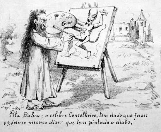 Antônio Conselheiro sempre foi retratado como uma figura excêntrica. As revistas não o pouparam. Aqui ele está “pintando o diabo” (sobretudo no combate que o governo travou contra ele e seus seguidores). Revista Illustrada (Rio de Janeiro) nº 727 – 1897