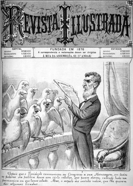 Prudente de Moraes lê sua mensagem ao Congresso, mas os nobres deputados e senadores são retratados como meros repetidores e, ainda assim, perigosos, com seus bicos afiados. Revista Illustrada (Rio de Janeiro) nº 736 – 1898