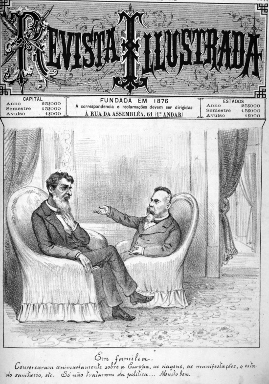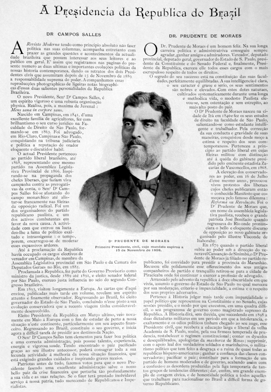 Prudente de Moraes e seu futuro sucessor Campos Salles, após o retorno deste da Europa, onde renegociara a dívida brasileira. A Revista Ilustrada , no entanto, mostrava a missão como um passeio qualquer, alheio à política. Revista Illustrada (Rio de Janeiro) nº 739 – 1898