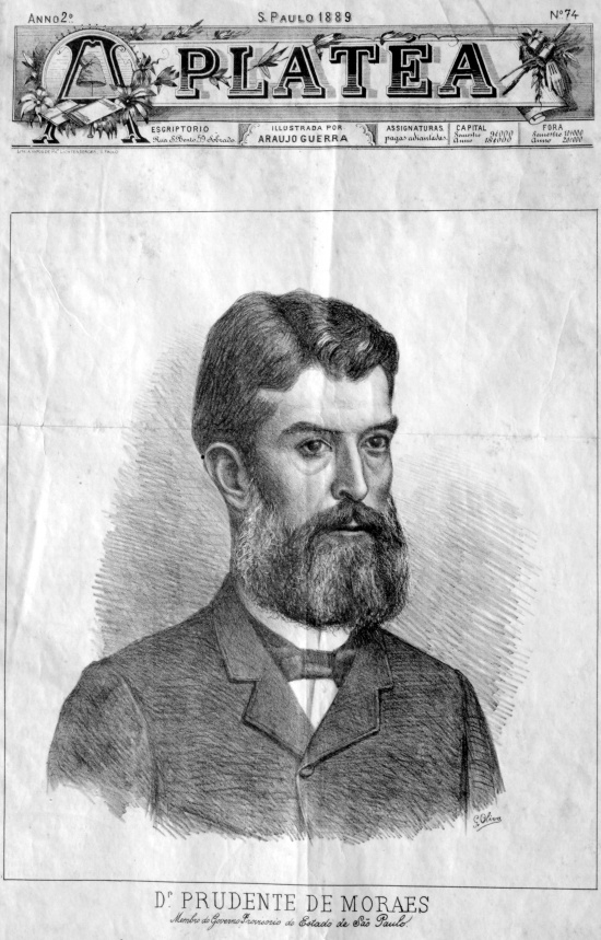 A Platéa estampa o retrato de Prudente de Moraes, um dos membros do triunvirato que compunha o Governo Provisório do Estado de São Paulo, recém-empossado após a Proclamação da República. A Platéa (São Paulo), nº 74 - 1889