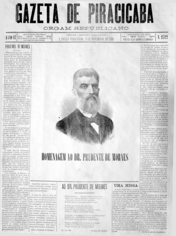 A "Gazeta de Piracicaba" homenageia Prudente de Moraes no encerramento de seu mandato presidencial. Gazeta de Piracicaba, nº 2.522 – 23/11/1898