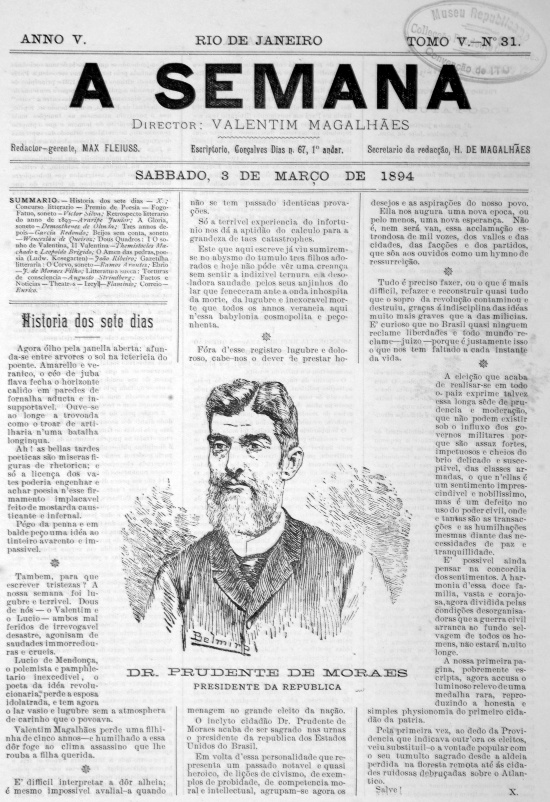 O hebdomadário carioca A Semana publica o retrato do novo presidente da República, eleito no dia 1º de Março. A Semana (Rio de Janeiro), nº 31 – 3/3/1894
