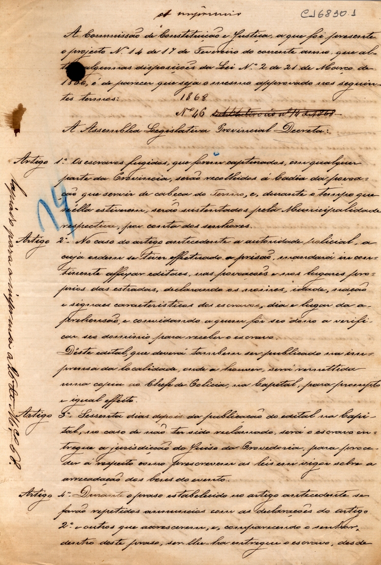 Alteração do Projeto de Lei nº 14, de 17 de fevereiro de 1868, pela Comissão de Constituição e Justiça, da qual Prudente de Moraes era membro. O projeto versava sobre a responsabilidade dos proprietários de escravos fugidos e recapturados pela polícia.