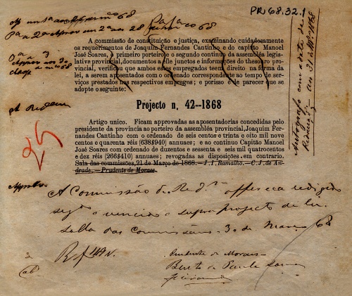 Projeto de Lei da Comissão de Redação, de 17 de março de 1868, elevando o imposto das pessoas que retirassem esmolas (angariassem fundos) fora de suas paróquias para festividades religiosas. A arrecadação ficaria para as Câmaras Municipais dos respectivos municípios para as obras de suas Igrejas Matrizes.
