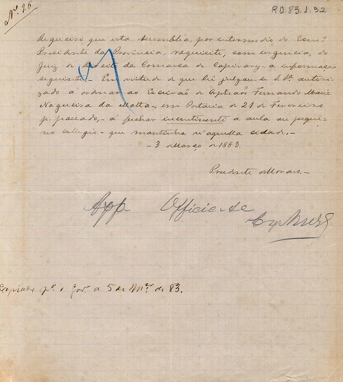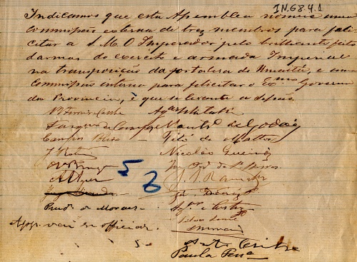 Indicação, de co-autoria de Prudente de Moraes, nomeando uma comissão para cumprimentar o Imperador Dom Pedro II pelo feito do Exército e da Armada Imperial na transposição da Fortaleza de Humaitá.