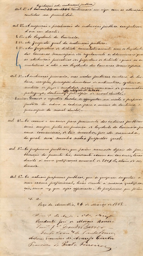 Projeto de Lei, de 26 de março de 1868, de co-autoria de Prudente de Moraes, alterando a legislação sobre Instrução Pública.