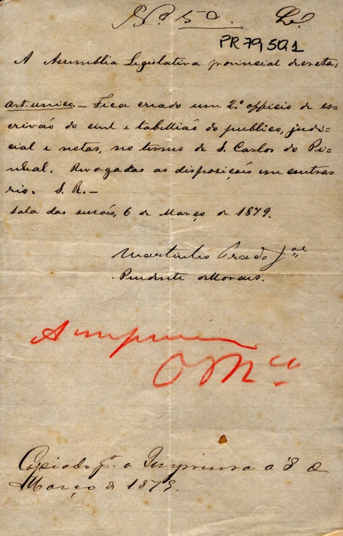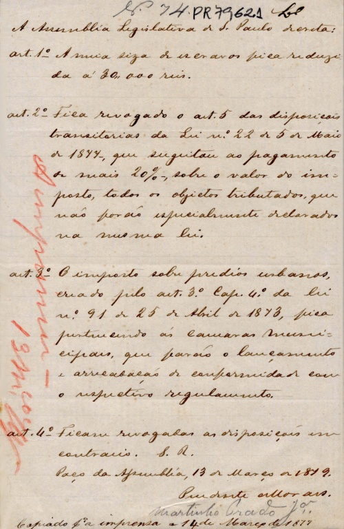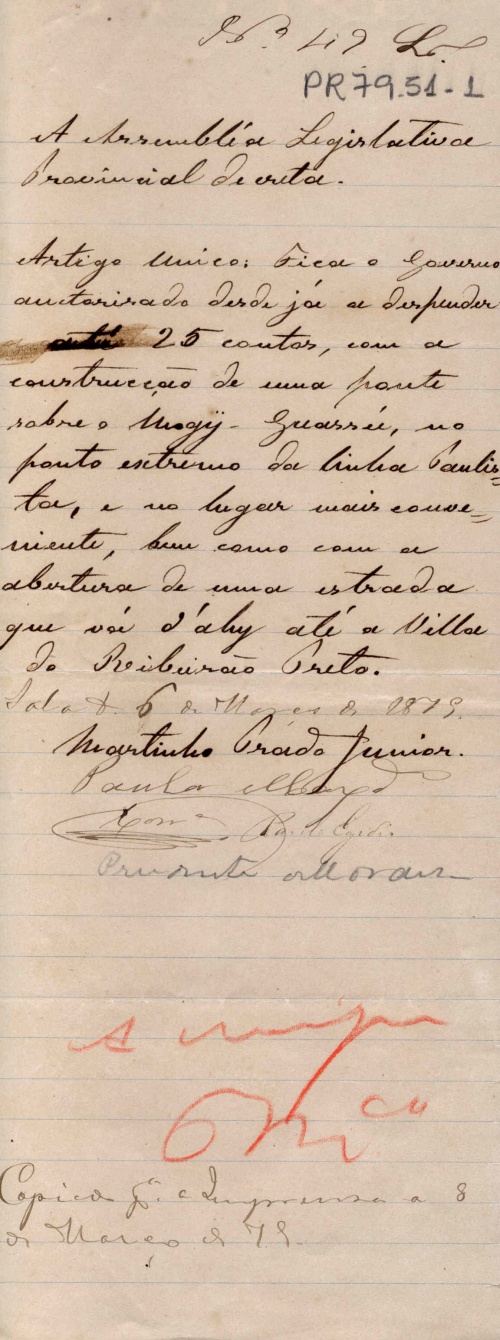 Projeto de Lei nº 49, de 6 de março de 1879, autorizando o governo a despender até 25 contos de réis com a construção de uma ponte sobre o Rio Mogi-Guaçu e a abertura de uma estrada até a vila do Ribeirão Preto.