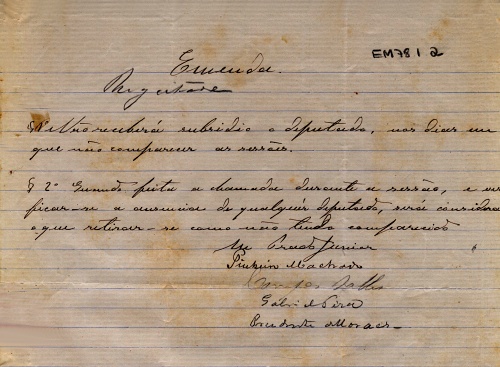 Emenda de autoria de Prudente de Moraes, sem data, versando sobre imposto sobre escravos oriundos de outras províncias, para coibir o tráfico de escravos entre províncias e constituir pecúlio para o próprio escravo poder comprar sua alforria.