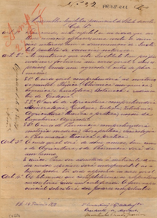 Projeto de Lei nº 32, de 25 de fevereiro de 1878, de co-autoria de Prudente de Moraes, criando um Instituto Paulista de Ciências Naturais, com cursos nas áreas de agricultura e farmácia.