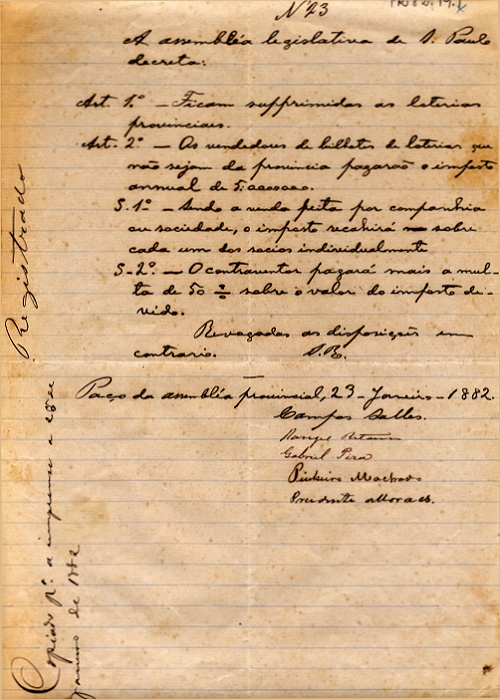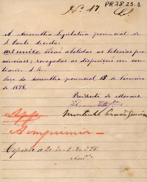 Projeto de Lei nº 17, de 19 de fevereiro de 1878, de autoria de Prudente de Moraes, abolindo as loterias provinciais.