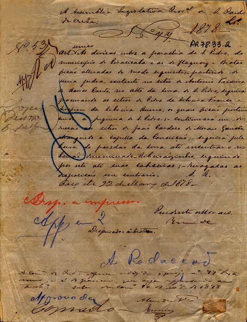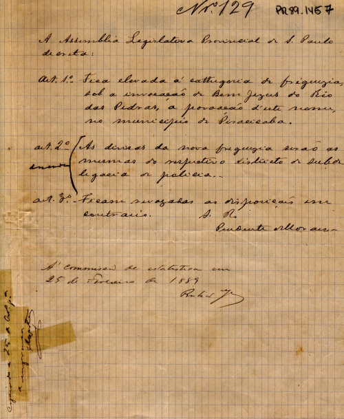 Projeto de Lei nº 77, de 22 de março de 1878, de autoria de Prudente de Moraes, alterando as divisas entre as paróquias de São Pedro, Itaqueri e Brotas, pertencentes ao município de Piracicaba.