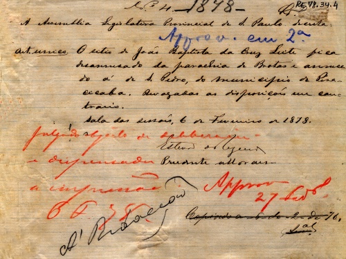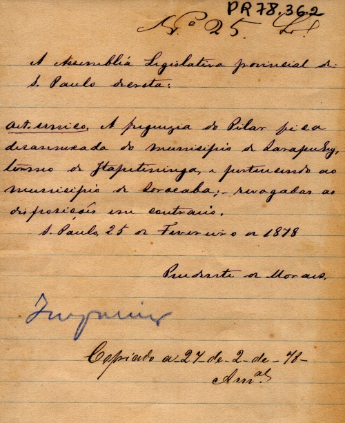 Projeto de Lei nº 25, de 25 de fevereiro de 1878, de autoria de Prudente de Moraes, que desanexa a freguesia do Pilar do município de Sarapuí e a anexa ao de Sorocaba.