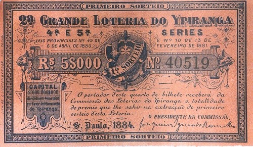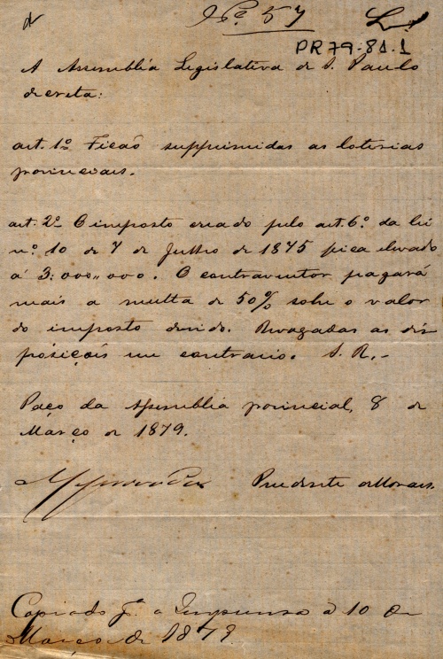 Projeto de Lei nº 57, de 8 de março de 1879, de co-autoria de Prudente de Moraes, suprimindo as loterias provinciais e elevando o imposto anual para os vendedores de bilhetes estranhos à província.