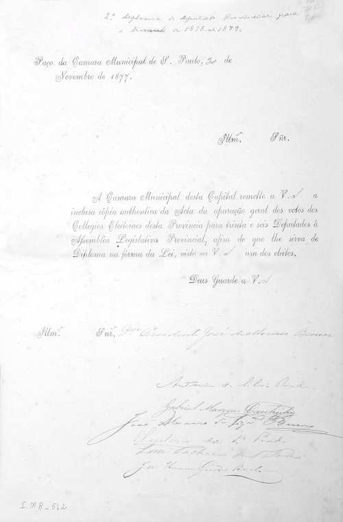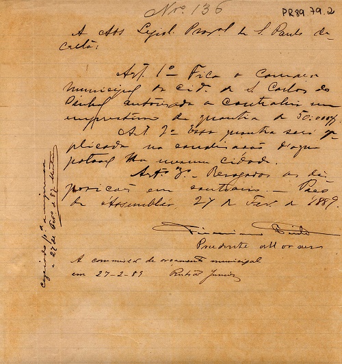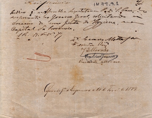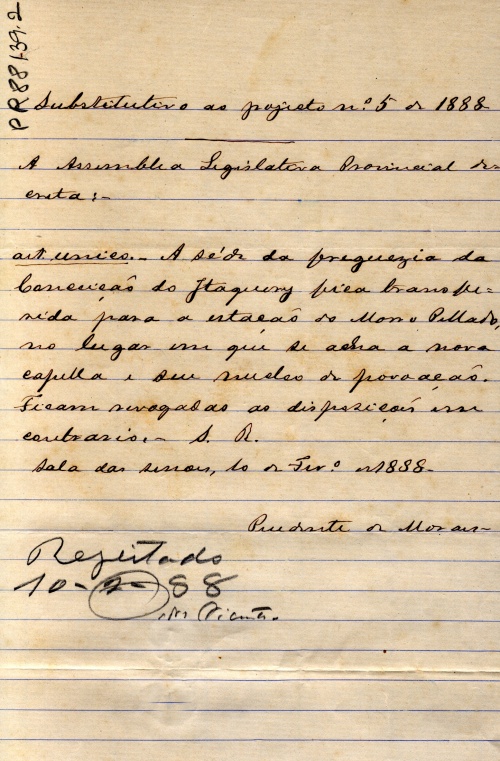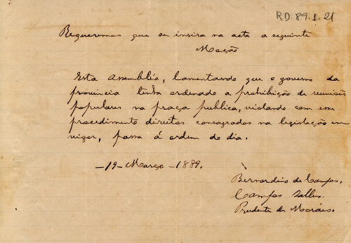 Moção, de 19 de março de 1889, de repúdio ao Governo da Província por proibir reunião de populares em praça pública violando, dessa forma, direitos consagrados pela legislação então vigente.