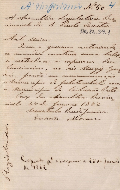 Projeto de Lei nº 50, de 24 de fevereiro de 1882, de co-autoria de Prudente de Moraes, autorizando o governo a construir uma balsa no Rio Mogi-Guaçu, para a comunicação entre os municípios de Jaboticabal e Ribeirão Preto.