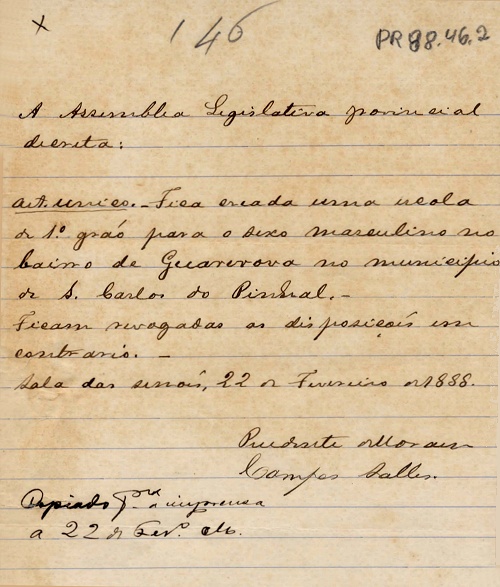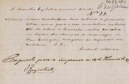 Projeto de Lei nº 39, de fevereiro de 1883, de autoria de Prudente de Moraes, criando duas cadeiras de primeiras letras em Piracicaba e Dois Córregos.