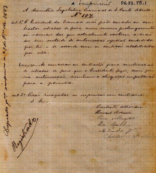 Projeto de Lei nº 145, de 11 de fevereiro de 1882, de autoria de Prudente de Moraes, autorizando a despesa de um conto e meio de réis, para a construção de cada uma das estradas de Dois Córregos, Jaú, Lençóis e Botucatu até as respectivas estações da Companhia de Navegação Fluvial Paulista.