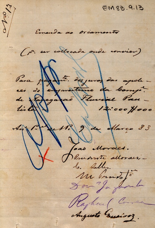 Emenda ao Projeto de Lei nº 27, de 1883, com apoiamento de Prudente de Moraes, que fixava as despesas e contingente da força policial da província de São Paulo.