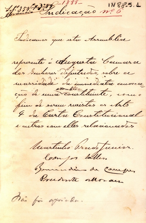 Indicação nº 6, de co-autoria de Prudente de Moraes, à Câmara dos Deputados, solicitando a convocação de Assembléia Constituinte, com o fim de serem revistos o art. 4º, que estabelecia que “a dinastia imperante é a do Senhor Dom Pedro I, atual Imperador e Defensor Perpétuo do Brasil”, e outros a ele relacionados.