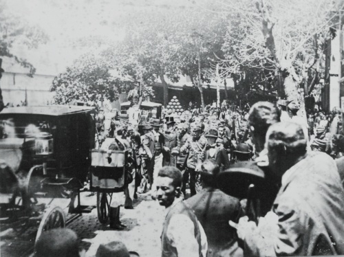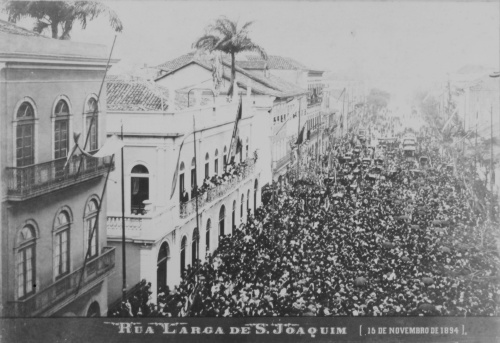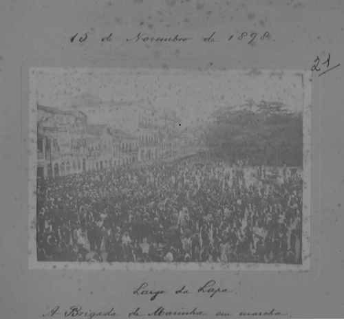 Largo da Lapa, Rio de Janeiro, em 15 de novembro de 1898. Nesta data, Prudente de Moraes deixou a presidência da república e uma multidão acompanhou sua despedida.