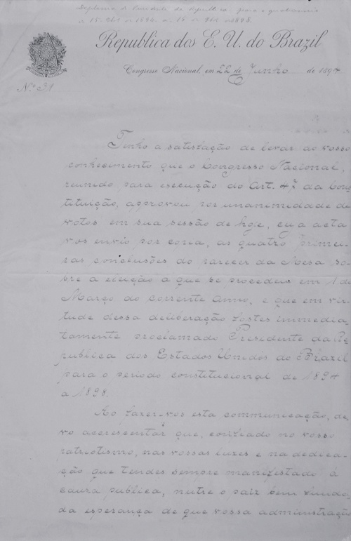 Diploma de Presidente da República dos Estados Unidos do Brasil no período de 1894 a 1898, conferido a Prudente de Moraes pelo Congresso Nacional.