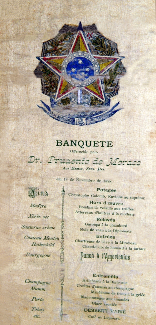 Menu do jantar de confraternização pela despedida de Prudente de Moraes da Presidência da República – 14 de novembro de 1898.