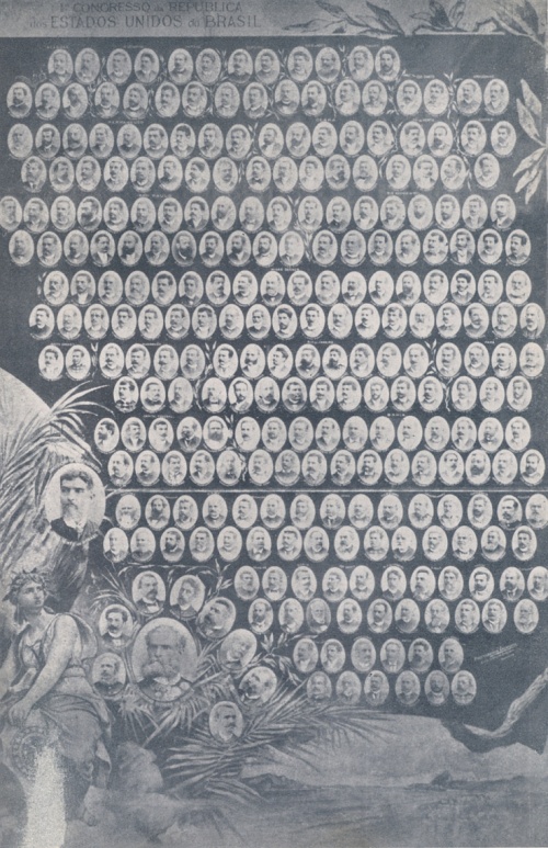 Imagem com os retratos dos Constituintes de 1891; em destaque o Presidente do Congresso Nacional Constituinte, Senador Prudente de Moraes e, mais abaixo, o Presidente da República, Marechal Deodoro da Fonseca.